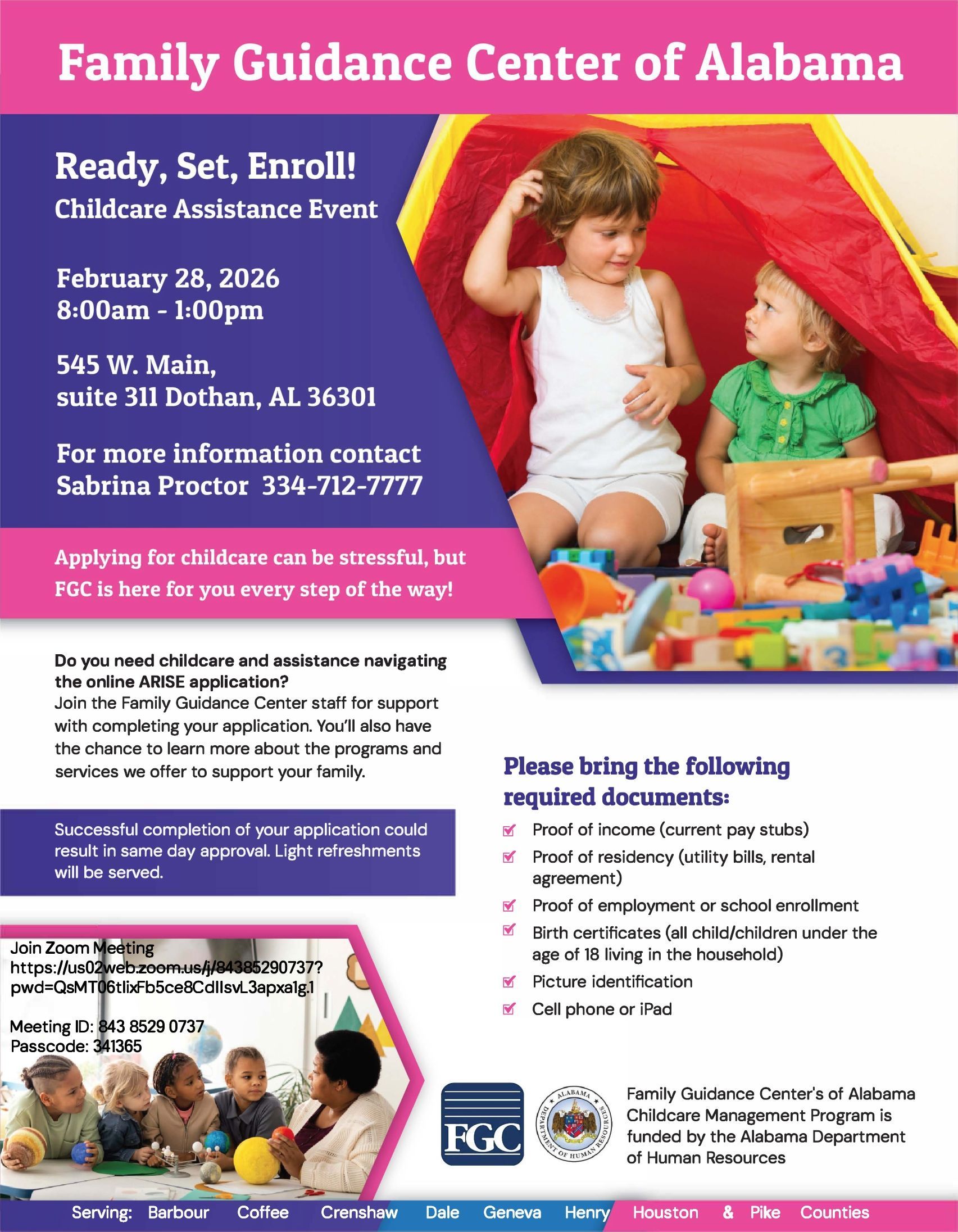 Family Guidance Center of Alabama is hosting Ready, Set, Enroll! to help families apply for childcare assistance with step-by-step, in-person support. Our team will assist with completing the ARISE application and answer questions about available programs and services. Same-day approval may be possible for completed applications.